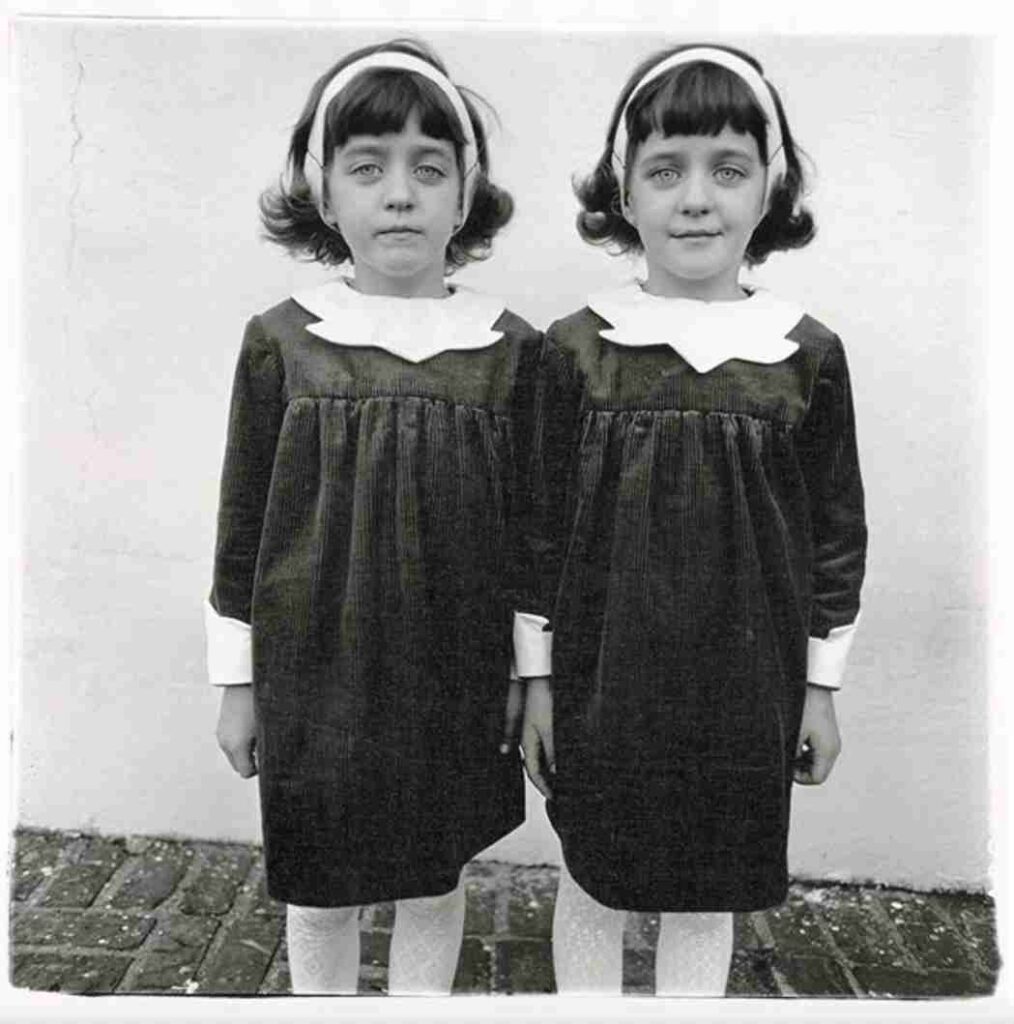 This portrait of Cathleen and Colleen Wade, identical twins in matching dresses, became iconic. The girls’ nearly symmetrical appearance contrasts with their subtly different expressions—one smiling slightly, the other unsmiling—conveying individuality within sameness.