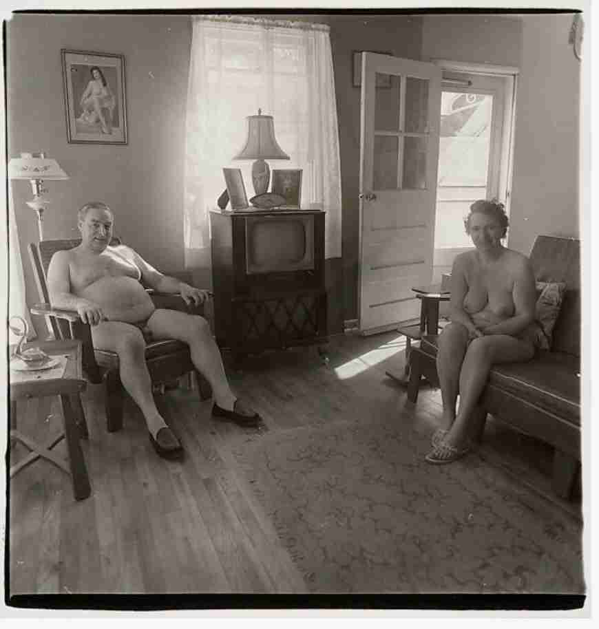 Taken in a New Jersey nudist colony, this portrait of an older couple is disarming in its straightforwardness.